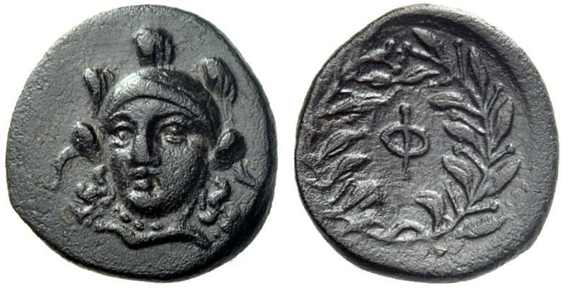 Phokis. Bronze, struck under Phalaikos, 351 BC. Æ 1.51 g., 12¢. Head and neck of Athena helmeted facing ¾ l. Rev. F in laurel wreath with berries. SNG Cop 114. Glossy, very dark brown, almost black patina and extremely fine.