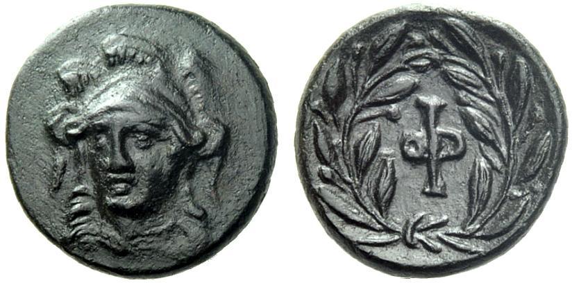 Phokis. Bronze, struck under Phalaikos, 351 BC and later. Æ 2.13 g., 12¢. Head and neck of Athena helmeted facing ¾ l. Rev. Large F of bold style in berried laurel wreath. See CNG Mail Bid Sale 61 (25 Sept. 2002) 225 for similar style. Glossy, dark green patina and good very fine / extremely fine.