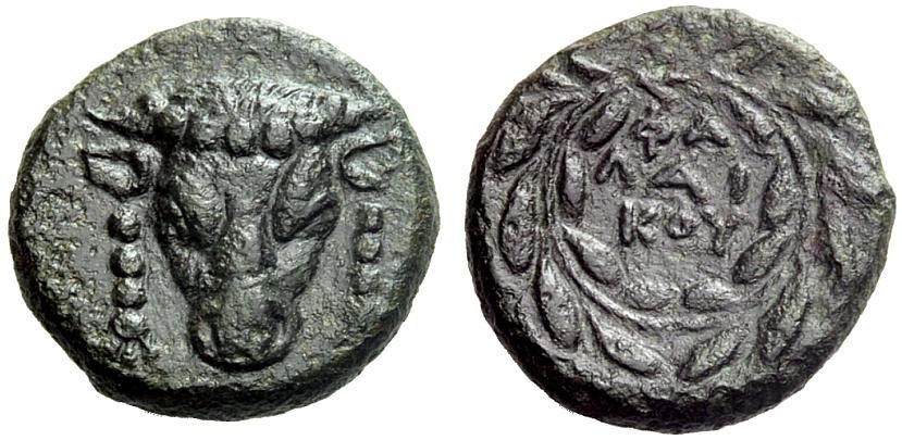 Phokis. Bronze, struck under Phalaikos, 351 BC and later. Æ 3.96 g., 2¢. Facing bull’s head, the style similar to the obverses of the coins in lots 321 to 324 above. Rev. FA-LAI-KOU in three lines, all enclosed in laurel wreath without berries tying above. See G. F. Hill, Historical Greek Coins (1906) p. 89 - 91, with etchings from the Berlin specimens. BMC 104. SNG Cop 132. Weber 3184. Light peripheral roughness otherwise, a nice coin with a dark green patina. Good very fine.