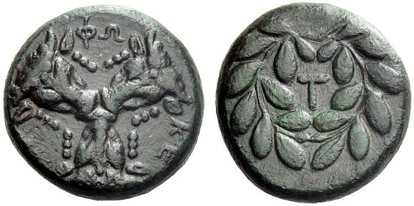 Phokis. Bronze, struck under Phalaikos, 351 BC and later. Æ 9.29 g. Three facing bull’s heads with sacrificial fillets, arranged in a triangle, their muzzles inwards and touching. FW-KE-[WN] circular and clockwise in the spaces between the tops of the bull heads. Rev. Large T in laurel wreath tying above. BMC 93, pl. III, 21. Laffaille 346. SNG Cop 125. Attractive smooth green patina and very fine or better.
