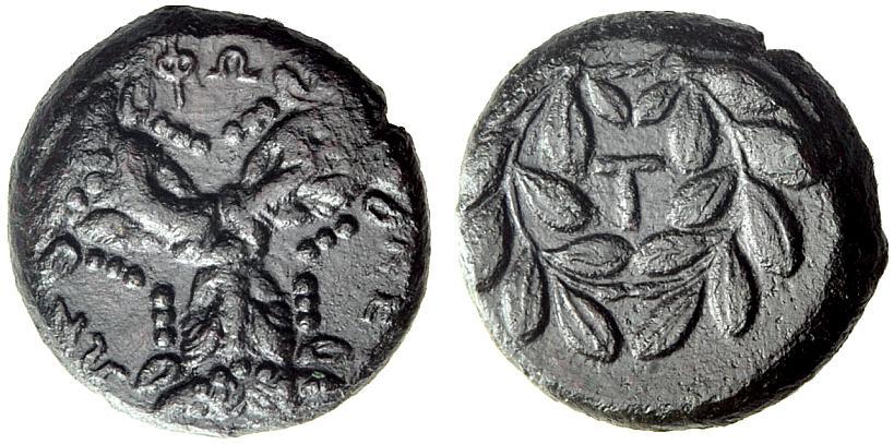 Phokis. Bronze, struck under Phalaikos, 351 BC and later. Æ 9.31 g. Three facing bull’s heads with sacrificial fillets, arranged in a triangle, their muzzles inwards and touching. FW-KE-WN circular and clockwise in the spaces between the tops of the bull heads. Rev. Large T in laurel wreath tying above. BMC 93, pl. III, 21. Laffaille 346. SNG Cop 125. An unusually well centred and struck example with the full obverse legend showing, nice dark green patina and good very fine.