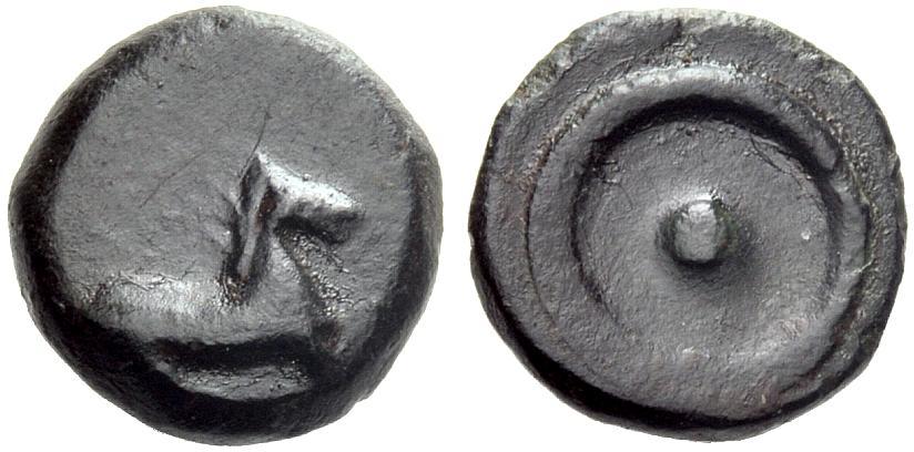 Phokis. Delphi. Bronze third quarter (?) of the 4th century BC. Æ 2.14 g. Horse galloping r. Rev. Omphalos or phiale. Svoronos p. 30, 35, pl. XXVII, 1 = Babelon, Traité II, 3, p. 345, 419, pl. CCVI, 7. Extremely rare, probably the second known, the other in Berlin. The obverse off-centre, otherwise with a nice shiny black patina and very fine.