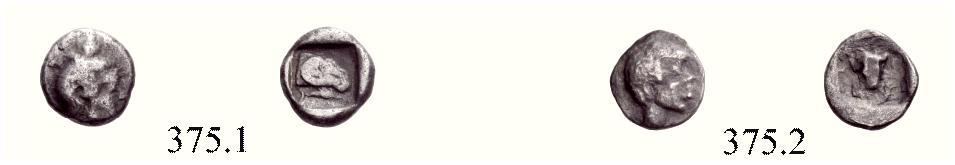 Phokis. Delphi. Lot of two silver fractions, early 5th century BC. 375.1: Obol, AR 0.76 g., 12¢. 375.2: Hemiobol, AR 0.48 g., 12¢. Both with head of a male Ethiopian r. Rev. Ram’s head r., beneath, dolphin r., all in incuse square (for the obol) and Rev. Goat’s head facing between two dolphins downwards (for the hemiobol). The obol off-centre and with a die flaw above the head on the obverse, otherwise toned and fine, the reverse better. The hemiobol toned and fine / nearly fine. 375.1: Ex Münzen und Medaillen list 421 (April 1980) 184 (CHF 140). 375.2: Acquired from Baldwin’s, January 1972, for £ 5.