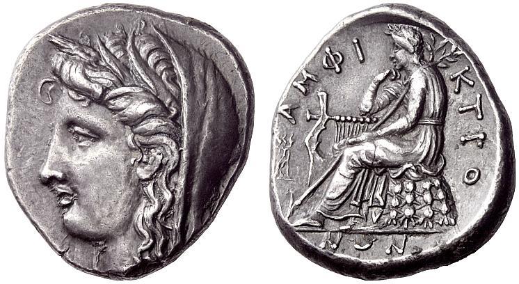 Phokis. Delphi. Stater, 336 - 335 BC. AR 12.29 g., 6¢. Head of Demeter l. wreathed with ears of wheat and veiled. Rev. Apollo Pythios, laureate and wearing chiton, seated l. on omphalos draped with himation; his r. elbow rests on lyre and his r. hand supports his chin; a long laurel branch rests diagonally across him; in field l., tripod. AMFI l. up, KTIO r. down, NWN in exergue, the W inverted. Kinns 9. Kunstwerke der Antike: Sammlung Robert Käpelli (1963) 82 (this coin). Wayte Raymond, The Pierpont Morgan Collection: Catalogue of Greek and Roman Coins (1953) 177 (this coin). A handsome coin type combining elegance and historical interest; this particular specimen is beautifully toned and with a splendid pedigree. Extremely fine. From the collections of Robert Käpelli and J. Pierpont Morgan, also, probably, from the Myonia hoard of 1899.