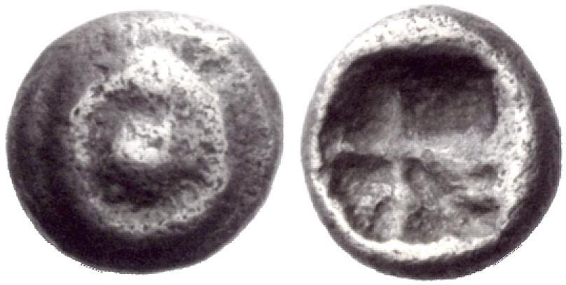 Phokis. Delphi. Tetartemorion, end of 6th century BC. AR 0.27 g. Omphalos or phiale. Rev. Deep incuse square, irregularly divided into four segments, die flaws within. Svoronos -. See Naville - Ars Classica V (18 June 1923) 1900 corr. [The Naville cataloguer refers wrongly to BMC 14 and Traité 1314, both of them being Theban tetartemoria.] Extremely rare, either one of two, or the only one known. Toned and about very fine. Ex Rasmussen 245, 10 March 1970 (Proschowsky) 629 (part).