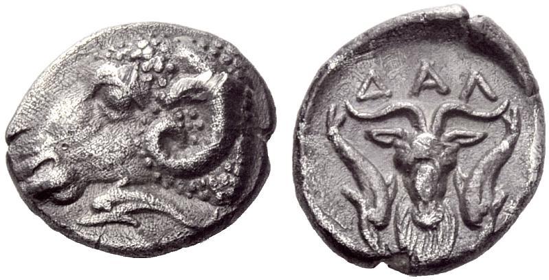 Phokis. Delphi. Trihemiobol, early 4th century BC. AR 1.30 g., 2¢. Ram’s head l., beneath, dolphin l. Rev. Incuse circle within which goat’s head facing between two dolphins downwards, above, DAL. Svoronos p. 27, 28, pl. XXVI, 24. Boston 976. A light scuff on the high relief area of the obverse, somewhat uneven but natural toning and very slightly porous surfaces, otherwise an attractive good very fine.