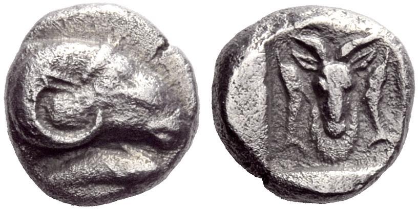 Phokis. Delphi. Trihemiobol, early 5th century BC. AR 1.36 g., 3¢. Ram’s head r., beneath, dolphin r. Rev. Incuse square within which goat’s head facing between two dolphins upwards. BMC 4, pl. IV, 3. Rare. Attractive light toning and good very fine.