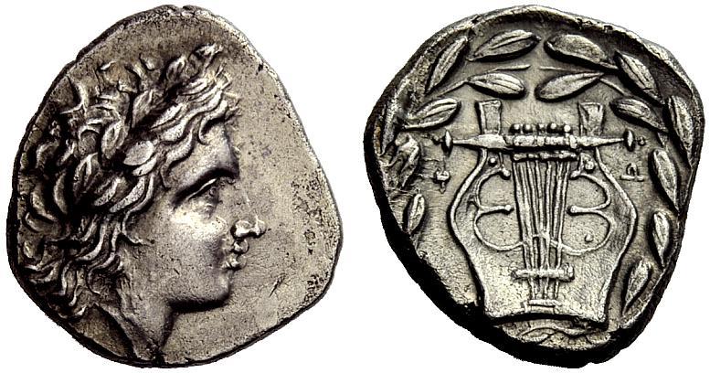Phokis. Federal coinage. Drachm, struck under Phalaikos, 351 BC and later. AR 4.83 g., 7¢. Head of Apollo, wreathed, to r., the hair rather loosely arranged and falling behind the neck in curls. Rev. Kithara of seven strings, F and W to either side in small letters, all in laurel wreath tying below. A great rarity and the 4th known. Superficial surface roughness on part of the obverse field, otherwise lightly toned and good very fine / extremely fine.