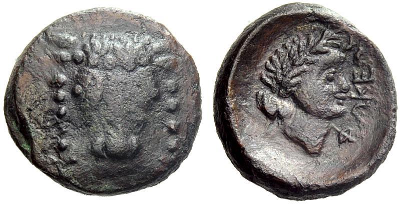 Phokis. Elateia. Bronze, late 4th century BC. Æ 4.72 g., 4¢. Facing bull’s head of a distinctive, “square” look, the sacrificial fillet showing as a line of pellets across its forehead and then falling on either side of the head. Rev. Wreathed head of Apollo r., of coarse style. FWKEWN r. up circular. SNG Cop 133. Reddish - brown patina and very fine / extremely fine.