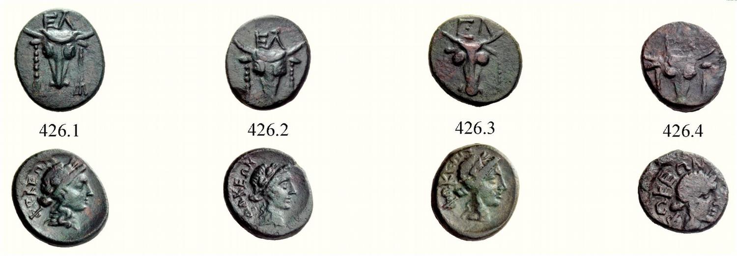 Phokis. Elateia. Lot of four bronze coins, early 2nd century BC. 426.1: Æ 3.57 g., 8¢. 426.2: Æ 3.62 g., 1¢. 426.3: Æ 4.75 g., 8¢. 426.4: Æ 3.21 g., 10¢. All with facing bull’s head, above, EL. Rev. Wreathed head of Apollo r., FWKEWN l. up circular. Olive-green patinas with touches of red, mixed conditions averaging about very fine
