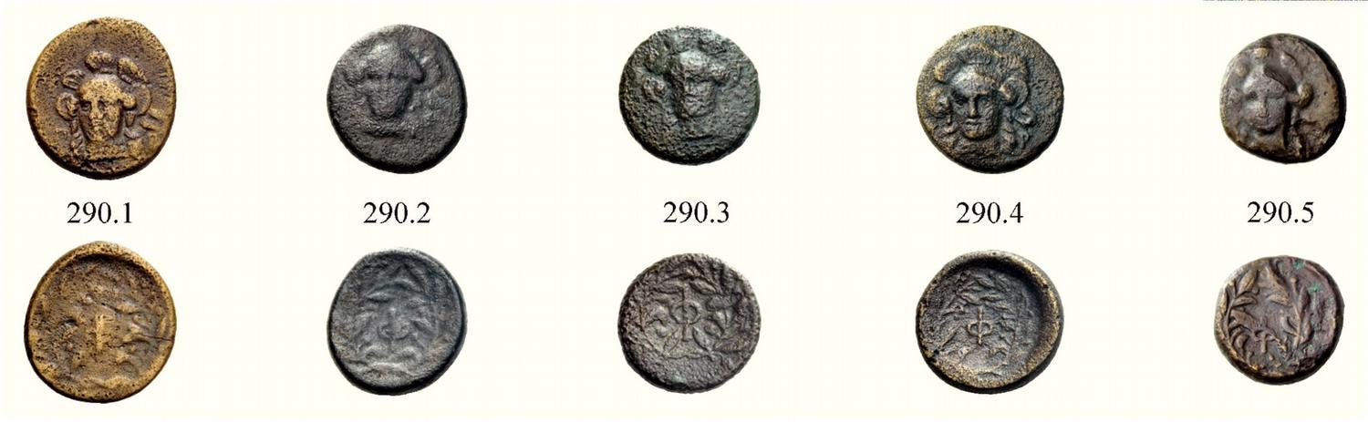 Phokis. Lot of five bronzes, 357 - 354 BC. 290.1: AR 3.15 g., 11¢. 290.2: AR 3.91 g., 12¢. 290.3: AR 3.12 g., 12¢. 290.4: AR 3.23 g., 11¢. 290.5: AR 3.17 g., 6¢. All with head of Athena helmeted facing ¾ l. Rev. F in berried laurel wreath. An assortment of the earliest Athena obverse bronzes and rare thus, the first and third have been cleaned long ago and have now toned, the third with pitted surfaces and the last with reverse die flaws and spots of bronze disease, otherwise good fine, some better. 290.1: Ex Peiresc 25 November 1995, lot 59 (part). 290.4: Ex Münzen und Medaillen list 575, May 1994, 169 (CHF 120).