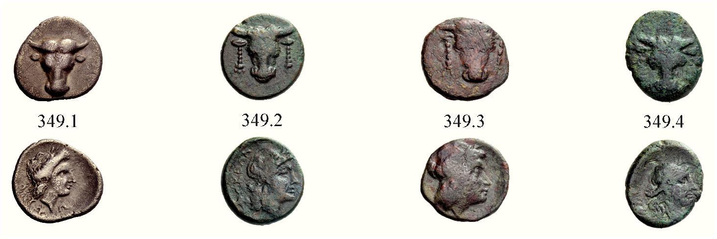 Phokis. Lot of one silver and three bronze coins attributed to the triumvirate that replaced Phalaikos, 347 - 346 BC. 349.1: AR 2.49 g., 1¢. 349.2: Æ 3.35 g., 12¢. 349.3: Æ 2.67 g., 12¢. 349.4: Æ 3.10 g., 12¢. Frontal bull’s head. Rev. Apollo head r. The silver rare and about very fine, the bronze very rare and fine or better.