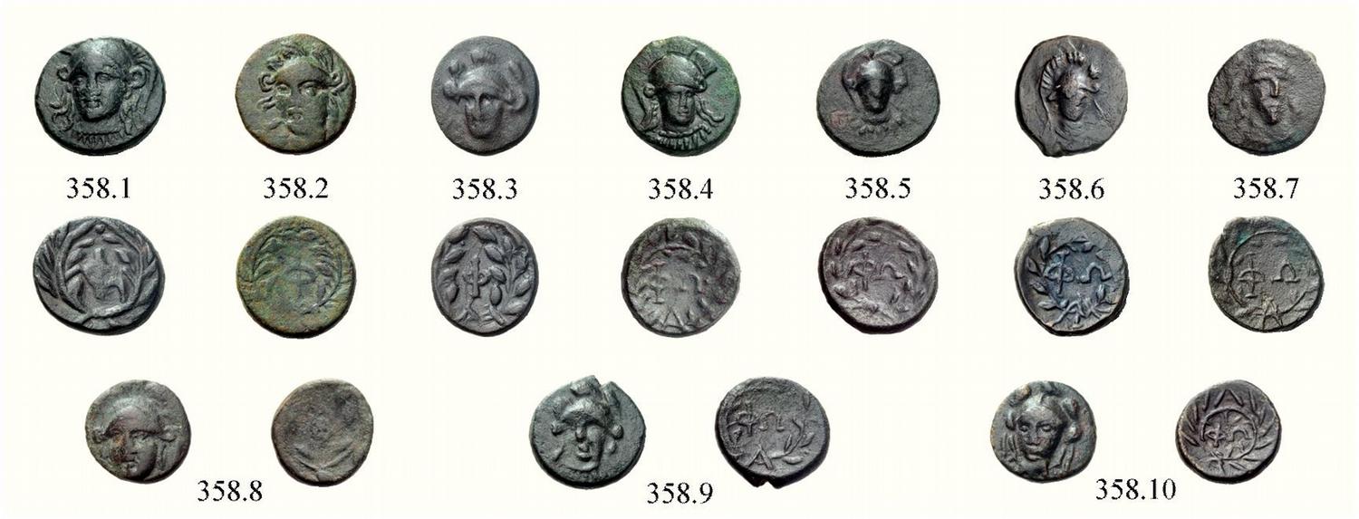 Phokis. Lot of ten bronze coins, late 4th or early 3rd centuries BC, perhaps also later. 358.1: Æ 2.71 g., 6¢. 358.2: Æ 2.02 g., 12¢. 358.3: Æ 1.77 g., 12¢. 358.4: Æ 2.31 g., 1¢. 358.5: Æ 1.80 g., 6¢. 358.6: Æ 1.97 g., 7¢. 358.7: Æ 1.88 g., 12¢. 358.8: Æ 1.33 g., 6¢. 358.9: Æ 1.85 g., 6¢. 358.10: Æ 1.36 g., 9¢. All with head and neck of Athena helmeted facing ¾ l. or r. Rev. F or FW in various styles and sizes in wreaths of varying detail. Mostly dark green patinas and fine to very fine.