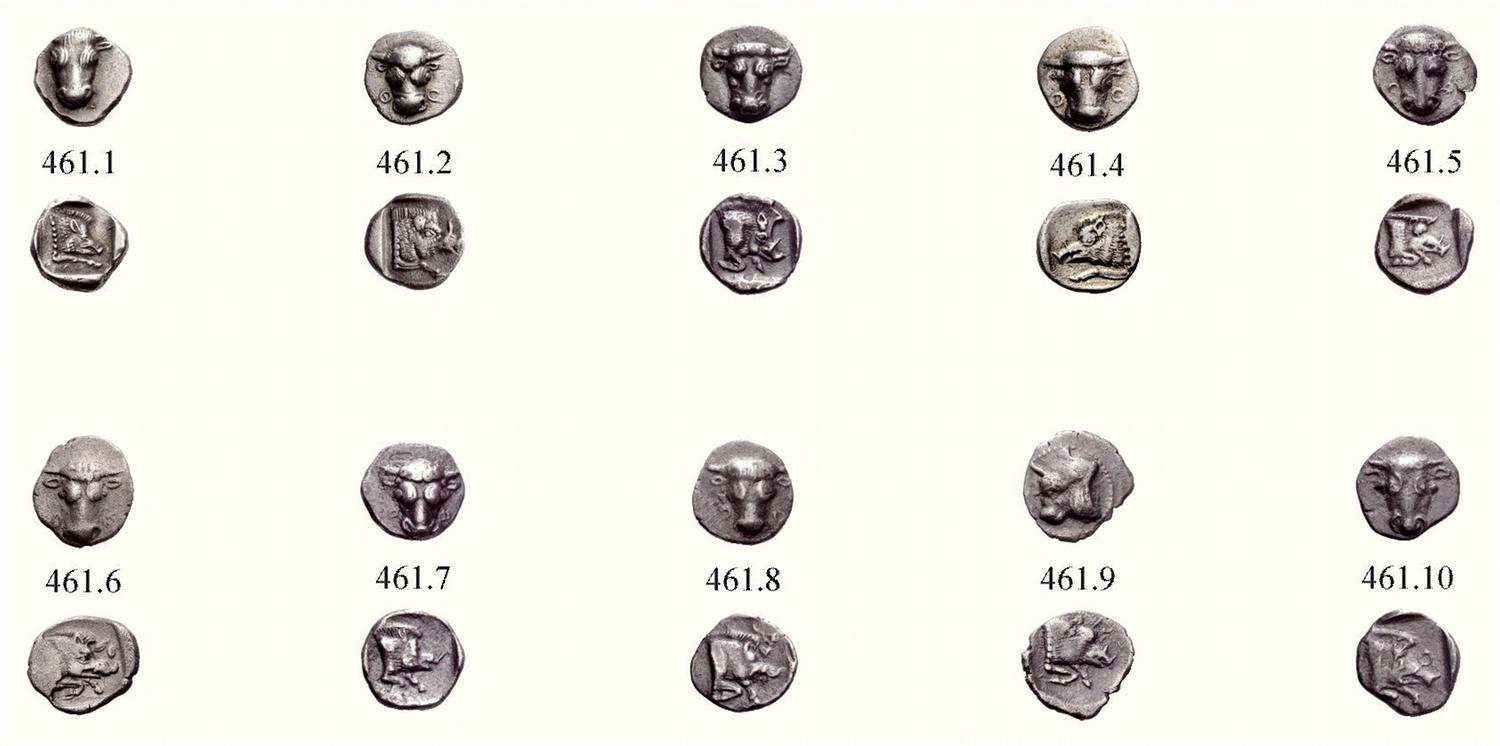 Multiple Lots. Lot of ten Phokis obols (includes two struck at Nikaia), 5th century BC. Very fine or better. 461.1: 1.03 g., 7¢. Acquired from Spink’s, April 1997, for £ 120. Dies not in Williams but part of the earliest issue of obols such as lots 171 ff above. 461.2: 0.94 g., 12¢. Williams 33 (O.25 / R.21). 461.3: 0.90 g., 12¢. Ex Spink 68 (22 March 1989) lot 63 (part). Williams - (O.- / R.58). The obverse is similar to O.67. Williams post 92. 461.4: 0.89 g., 10¢. Williams 134 corr. (O.94 / R.79). [SNG Lockett 1713 is clearly O.94 / R.79 and not O.95 / R.79]. This coin should therefore be Williams 133 bis. 461.5: 0.95 g., 7¢. Williams 177 (O.125 / R.108). 461.6: 1.03 g., 9¢. Williams 210 (O.151 / R.124). 461.7: 0.96 g., 8¢. Williams 222 (O.158 / R.130). 461.8: 0.89 g., 4¢. Williams 269 (O.193 / R.159). 461.9: 0.75 g., 3¢. Not in Williams but the obverse from the same hand as O.196 and O.197 and the reverse from the same hand as R.165. Obviously a coin of Nikaia. Williams post 274. 461.10: 0.87 g., 12¢. Acquired in June 1980 from Professor H. C. Lindgren who purchased it in 1968 while in Athens. Dies not in Williams but style similar to section 19 (see R.164) and therefore a coin of Nikaia. Williams post 282. A group of choice Phokian obols, some of them very attractive indeed.