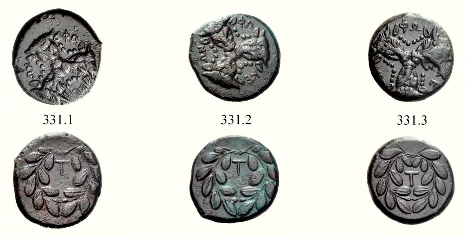 Phokis. Lot of three bronze coins struck under Phalaikos, 351 BC and later. 331.1: Æ 9.20 g. 331.2: Æ 7.86 g. 331.3: Æ 8.62 g. All with three facing bull’s heads with sacrificial fillets, arranged in a triangle, their muzzles inwards and touching. FW-KE-WN circular and clockwise in the spaces between the tops of the bull heads. Rev. Large T in laurel wreath tying above. BMC 93, pl. III, 21. Laffaille 346. SNG Cop 125. The first slightly off-centre on the obverse but struck on a large flan and with nothing missing from the images, the second with some surface discolouration on the obverse and a slightly patchy green patina on the reverse and the third with an obverse die flaw obscuring the letter K and half a bull’s head, otherwise very fine. 331.1: Ex Spink’s Numismatic Circular, October 1970, 10836 (£ 38).331.2: Acquired from Baldwin’s, January 1972, for £ 5.