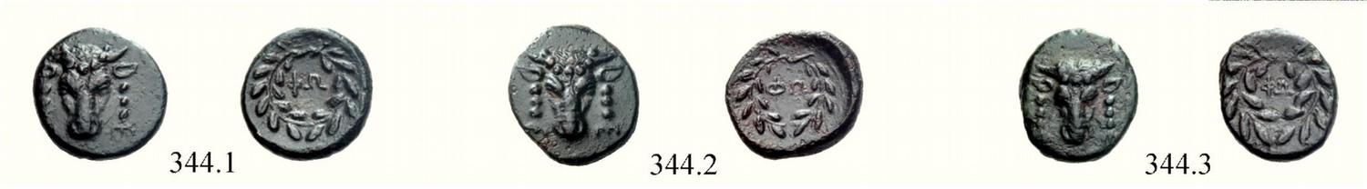 Phokis. Lot of three bronze coins, struck under Phalaikos or later, after 351 BC. 344.1: Æ 2.41 g., 1¢. 344.2: Æ 2.48 g., 11¢. 344.3: Æ 2.33 g., 7¢. Facing bull’s head, the obverse style deriving from the obverses of the coins in lots 326 and 327 above but the heads smaller and narrower, especially in the area of the nasal bone. The fillets end in three-pronged tassels. Rev. Concave flan, FW in laurel wreath with smaller leaves without berries tying above. De Luynes 1969. With dark green patinas and very fine or better. 344.1: Acquired from Bank Leu, January 1975 and from the old stock of Jacob Hirsch. 344.3: Ex Victor England Fixed Price List Vol. XII, 1 (Jan. 1987) 19 ($ 130).