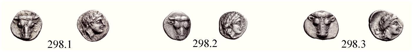 Phokis. Lot of three silver obols struck under Onymarchos or Phayllos, 354 - 351 BC. 298.1: AR 0.72 g., 7¢. 298.2: AR 2.64 g., 5¢. 298.3: AR 0.68 g., 5¢. Frontal bull’s head. Rev. Head of Apollo r., behind, lyre. All coins with slightly etched or pitted surfaces and the obverse of the second coin off-centre, otherwise lightly toned and rare in this condition. Averaging very fine.