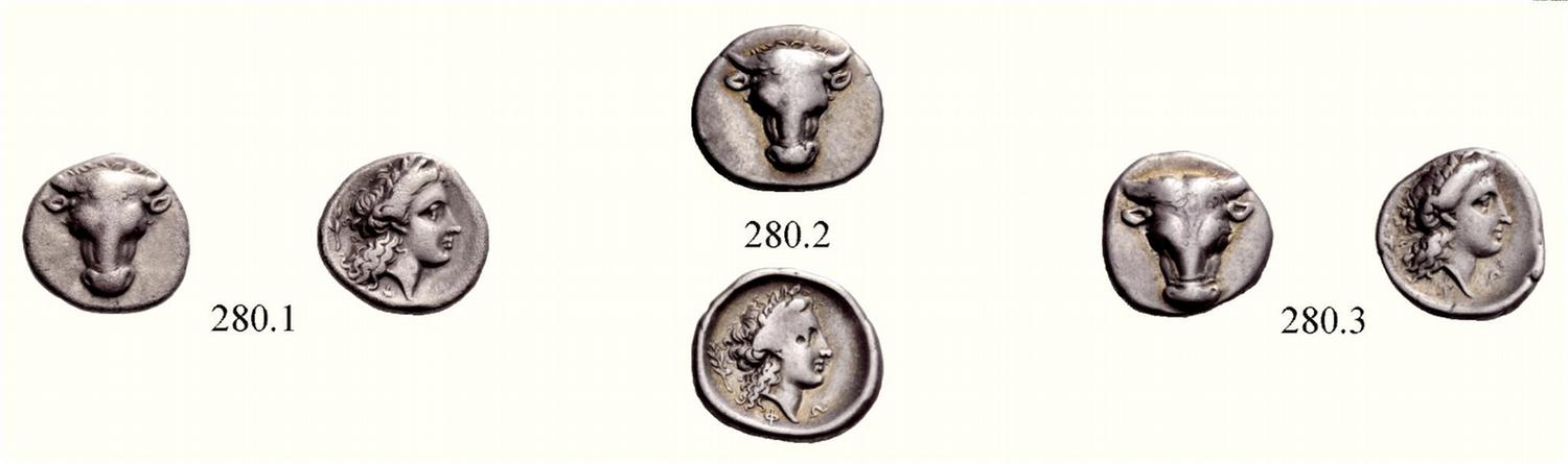 Phokis. Lot of three silver triobols struck under Philomelos, 357 - 354 BC. 280.1: AR 2.64 g., 11¢. 280.2: AR 2.73 g., 12¢. 280.3: AR 2.77 g., 5¢. Frontal bull’s head. Rev. Head of Apollo as above. Williams 315 (O.224 / R.188). Williams - (O.224 / R.192). Williams - (O.225 / R.196). 280.3 from the same reverse die as 281.1 below. The second coin struck on a large flan but with some flatness, especially on the reverse. All three in good metal, centred, lightly toned with some iridescence and about very fine.