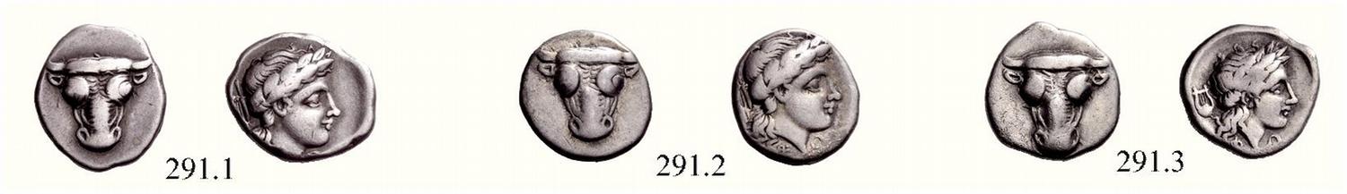 Phokis. Lot of three silver triobols struck under Onymarchos, 354 - 352 BC. 291.1: AR 2.79 g., 9¢. 291.2: AR 2.79 g., 8¢. 291.3: AR 2.74 g., 11¢. Frontal bull’s head in lower relief and of different style. Rev. Head of Apollo r., of more “boyish” style, behind his head, lyre. The first two coins from the same reverse die. Three attractive coins in good silver and difficult to find in better condition. The first nicely toned, the other two have been cleaned and are now beginning to tone. Very fine. 291.1: Ex Auctiones 23 (17 June 1993) 309 (CHF 525).