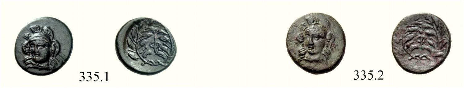 Phokis. Lot of two bronze coins, struck under Phalaikos, 351 BC. 335.1: Æ 2.21 g., 1¢. 335.2: Æ 2.25 g., 12¢. Both with head and neck of Athena helmeted facing ¾ l. Rev. F in laurel wreath with berries. SNG Christomanos 724. Two more portraits of Athena possibly minted under Phalaikos. Dark and light olive-green patinas, very fine or better.