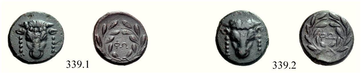 Phokis. Lot of two bronze coins, struck under Phalaikos, 351 BC and later. 339.1: Æ 3.90 g., 5¢. 339.2: Æ 4.53 g., 2¢. Both with facing bull’s head, the style similar to the obverses of the coins in lots 326 and 327 above. Rev. FW in laurel wreath without berries tying below. Two pleasing bronzes, both with dark green patinas and very fine.