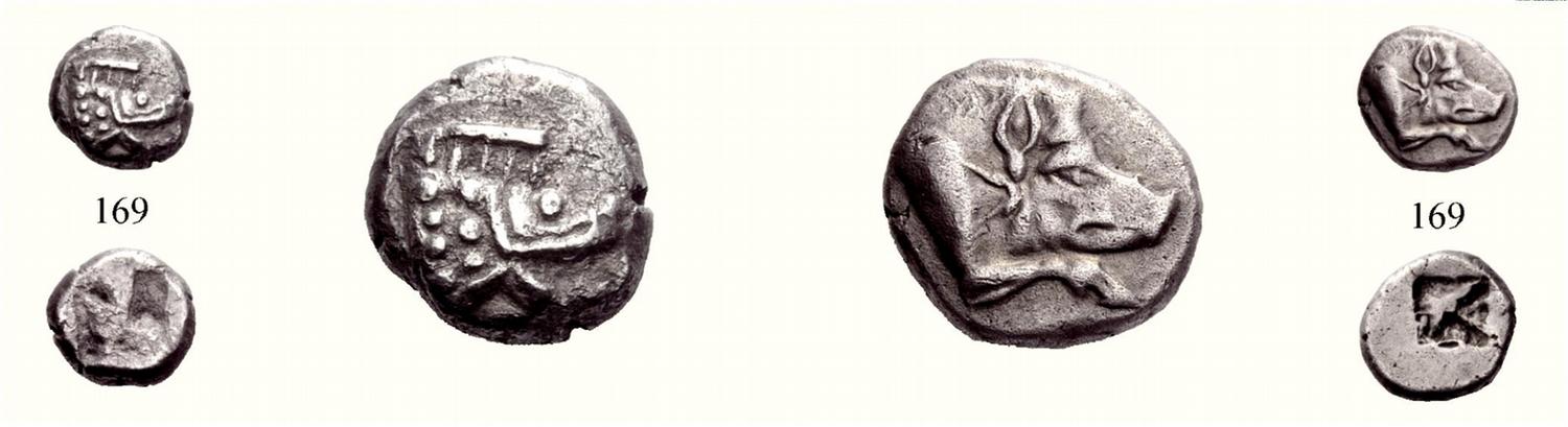 Phokis. Lot of two coins. 169.1: Quarter stater, late 6th century BC, AR 3.31 g. 169.2: Tetrobol, circa 500 BC, AR 3.03 g. Both with forepart of boar r., showing only one of its forelegs. Rev. irregular incuse. No reference found for the first coin, the second as Rosen 685. Both lightly toned, the second an attractive specimen. Very fine. 169.1: Ex Elsen 74 (21 June 2003) 165. 169.2: Ex Hauck & Aufhäuser 18 (5 Oct. 2004) 305.