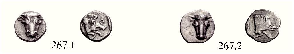 Phokis. Lot of two silver obols, last quarter of the 5th century BC. 267.1: AR 0.96 g., 3¢. 267.2: AR 0.66 g., 3¢. Bull’s head facing, no letters visible on the first coin, O and O to l. and r. of the muzzle on the second. Rev. Boar forepart to r. in incuse square, both legs showing below, on the first coin O above the boar’s snout. Rare. The first coin slightly off-centre and the second with an obverse scratch, otherwise lightly toned and very fine or better.