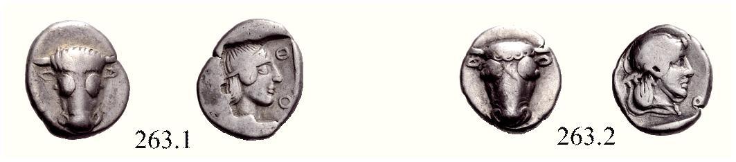 Phokis. Lot of two silver triobols, 425 - 400 BC. 263.1: AR 2.75 g., 12¢. 263.2: AR 2.76 g., 6¢. Both with frontal bull’s head, the first with the hair in vertical lines, the second with the hair in ringlets. Rev. Artemis in incuse to r. on both, the first with F above r. and O below r., the second with O below r. Lightly toned and about very fine.