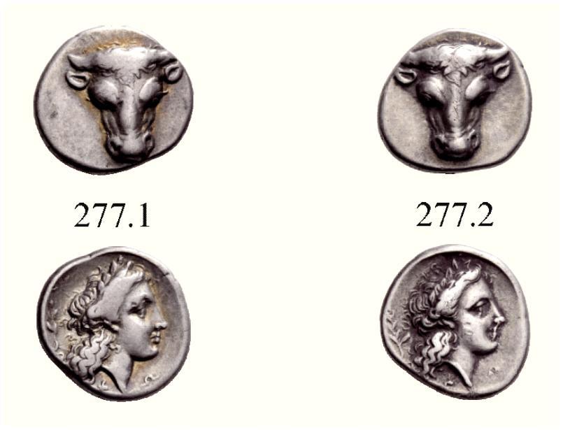 Phokis. Lot of two silver triobols struck under Philomelos, 357 - 354 BC. 277.1: AR 2.76 g., 11¢. 277.2: AR 2.75 g., 11¢. Both from the same obverse die, with frontal bull’s head in the 4th century style. Rev. Head of Apollo r., laureate, behind, laurel branch, F and W below and in front of neck. Williams - (O.221 / R.188) and Williams 305 (O.221 / R.190). Nice metal and surfaces, the first with very light iridescent toning and about very fine, the second with a slight bump on Apollo’s cheek, otherwise lightly toned and very fine.