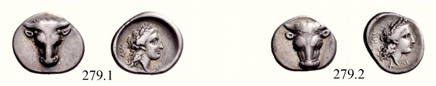Phokis. Lot of two silver triobols struck under Philomelos, 357 - 354 BC. 279.1: AR 2.80 g., 12¢. 279.2: AR 2.76 g., 11¢. Frontal bull’s head. Rev. Head of Apollo as above. Williams 311 (O.222 / R.193) and Williams - (O.- / R.197). Both well struck, the first on a large flan. Lightly toned and very fine.