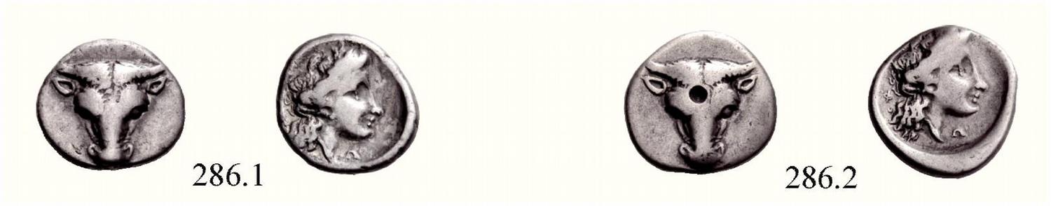 Phokis. Lot of two silver triobols, 357 - 354 BC or later. 286.1: AR 2.49 g., 5¢. 286.2: AR 2.43 g., 3¢. Frontal bull’s head. Rev. Head of Apollo r., F behind the head (not below the neck). Dies not in Williams, the two coins are die duplicates and stylistically seem to imitate the issue of Philomelos rather than belong to it. The second coin, although from the same dies as the first, seems to be struck out of less pure silver (hence the drill test mark on its obverse) and both their weights are on the low side. Another very unusual and interesting pair, probably an unknown variety. An ancient drill-type test mark on the obverse of the second coin, otherwise toned and about very fine.