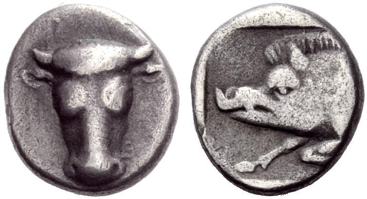 Phokis. Federal coinage. Obol, 478 - 460 BC. AR 0.81 g., 7¢. Frontal, rather narrow bull’s head, the ears protruding further out from the small horns that turn upwards at their ends. The hair is rendered in vertical lines and there are traces of a F very close and above the r. nostril. Rev. Naturalistic boar forepart to l. in incuse square showing both legs. Dies not in Williams. Williams post 103? Attractive light grey toning and well centred. A neat looking coin. Nearly very fine. Acquired from Peus, Frankfurt, May 1978, for DM 450.