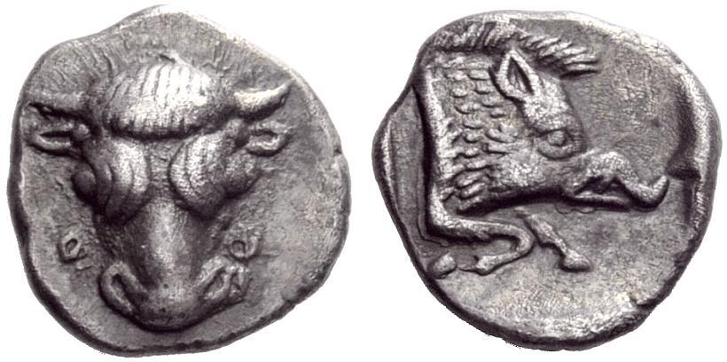 Phokis. Federal coinage. Obol, second half of the 5th century BC. AR 0.95 g., 3¢. Facing bull’s head, the hair shown in vertical lines, O to l. and F to r. Rev. Boar forepart to r. in shallow incuse square, both legs showing. Williams 287 (O.206 / R.174). A pleasing fraction of fine style, toned and good very fine. Acquired from Baldwin’s, June 1971, for £ 25.