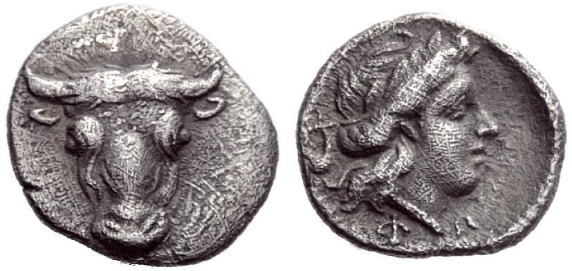 Phokis. Federal coinage. Obol, struck under Phayllos, 352 - 351 BC. AR 0.84 g., 4¢. Frontal bull’s head. Rev. Head of Apollo r., behind, lyre. Williams 409 (O.271 / R.236). Slightly rough surfaces, otherwise well centred and attractively toned. Very fine or better.
