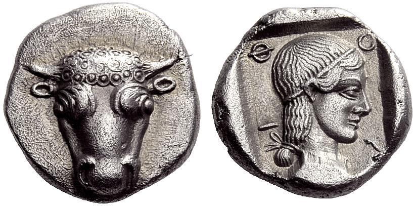 Phokis. Federal coinage. Triobol, 445 - 420 BC. AR 2.88 g., 2¢. Frontal bull’s head, the hair in ringlets and a pellet inside each ringlet. Rev. Diademed head of Artemis r. in superb style, the hair taken into a queue at the back of the head. The eye is profiled. F-O-K-I, clockwise from top l., the K probably reversed and the I sideways and higher up from the corner of the incuse. Dies not in Williams but see O.170 for a similar obverse style. For the reverse see BCD Peloponnesos 1407. If this coin is not from the same hand then it must surely be contemporary. Williams post 246. An enchantingly beautiful coin. Very lightly toned and extremely fine or better.