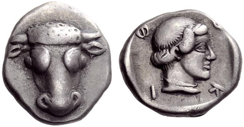 Phokis. Federal coinage. Triobol, 449 - 447 BC. AR 2.99 g., 3¢. Frontal bull’s head, the hair in ringlets. Rev. Head of Artemis r. in incuse square, her hair is now arranged in a loop at the temple and a roll at the back of the head. The eye is profiled. F-O-K-I, clockwise from top l. Williams 214 (O.154 / R.127). A beautifully toned and well struck coin of superb style. Good very fine.