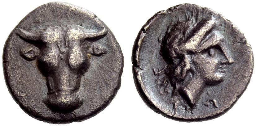 Phokis. Federal coinage. Triobol, attributed to the triumvirate that replaced Phalaikos, 347 - 346 BC. AR 2.55 g., 10¢. Frontal bull’s head of distinctive style, imitating the obverses of Williams section A (branch group). Rev. A rough copy of the Apollo heads of the same section but clearly without a branch in field l. Williams 332 (O.231 / R.203) corr. [No branch symbol to l. on reverse.] Rare. Nicely centred and toned. Very fine. Acquired from Bank Leu, December 1989, for CHF 300.