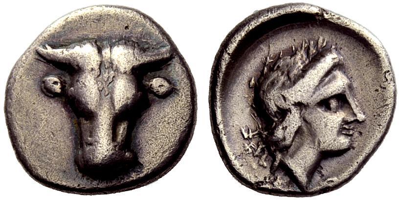 Phokis. Federal coinage. Triobol, attributed to the triumvirate that replaced Phalaikos, 347 - 346 BC. AR 2.69 g., 10¢. Frontal bull’s head as above. Rev. Apollo head as above. Williams - (O.- / R.203) corr. [No branch symbol behind head on reverse.] Rare. Nicely centred and lightly toned. About very fine. Acquired from Guy Clark, Boston, September 1994, for $ 140.