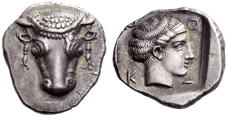 Phokis. Federal coinage. Triobol, circa 418 BC. AR 2.99 g., 9¢. Frontal bull’s head decorated with a fillet running along the brow and falling behind the horns and below the ears. Rev. Head of Artemis r. in incuse square, her hair is rolled up in waves, an ampyx (band) on her forehead. The eye is profiled. F-O-K-I, anticlockwise from top r., the I sideways. Williams 259b (this coin) (O.183 / R.152. A coin of stunning beauty and quality, the best known from these dies. Good extremely fine.