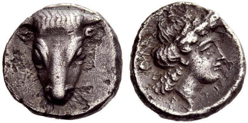 Phokis. Federal coinage. Triobol, struck under Phalaikos, 351 BC and later. AR 2.24 g., 4¢. Frontal bull’s head of distinctive triangular shape and without detail between the eyes or down the nasal bone, resembling the obverses of Phalaikos’ bronzes (see lots 326 to 331 below). Rev. A fine head of Apollo r., the lyre symbol behind it obscured by a die flaw. Williams - (O.- / R.240). Same obverse hand as O.274. Same reverse die as 324.1 below. Very rare. Traces of corrosion in the fields, otherwise toned and very fine. Acquired from John Cummings, October 1993, for £ 65.