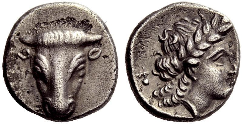 Phokis. Federal coinage. Triobol, struck under Phalaikos, 351 BC and later. AR 2.27 g., 6¢. Frontal bull’s head of distinctive triangular shape and without detail between the eyes or down the nasal bone, resembling the obverses of Phalaikos’ bronzes (see lots 326 to 331 below). Rev. A fine head of Apollo r. with a small lyre symbol behind it. Dies not in Williams but obverse and reverse from the same hands as O.274 and R.240. Very rare. Traces of corrosion and light deposits mostly on the obverse field, otherwise lightly toned and very fine / good very fine.