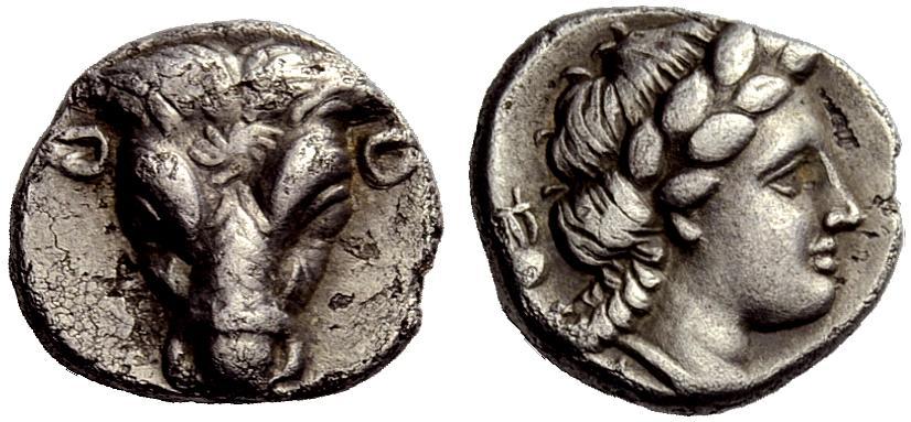 Phokis. Federal coinage. Triobol, struck under Phalaikos, 351 BC and later. AR 2.30 g., 12¢. Frontal bull’s head of distinctive triangular shape and some detail between the eyes and down the nasal bone, resembling the obverses of Phalaikos’ bronzes (see lots 326 to 331 below). Rev. A fine head of Apollo r. with a small lyre symbol behind it. Dies not in Williams but obverse ane reverse from the same hands as Williams O.275 and R.240. Very rare. A few traces of corrosion, mostly on the obverse fields, otherwise lightly toned and good very fine / extremely fine.