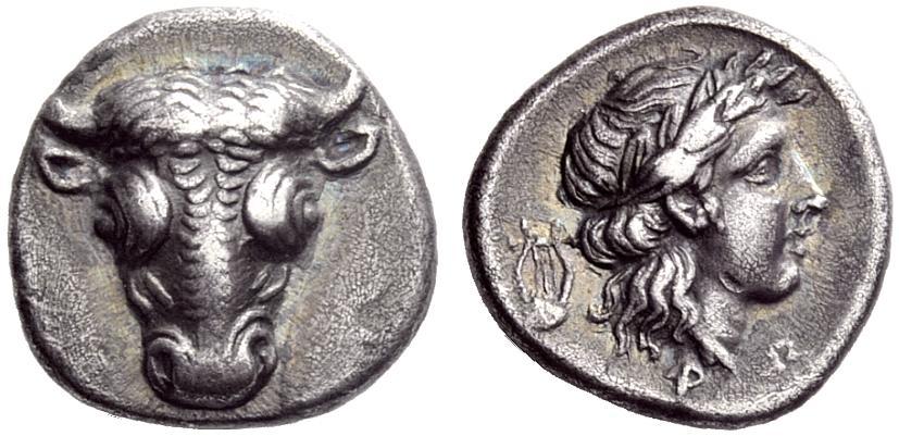 Phokis. Federal coinage. Triobol, struck under Phayllos, 352 - 351 BC. AR 2.79 g., 11¢. Frontal bull’s head. Rev. Head of Apollo r., behind, lyre. Williams 384 (O.266 / R.225). Same reverse die with all coins of lot 304 above and lot 310.3 below. A perfectly centred, toned and attractive coin. Nearly extremely fine. Ex Leu 33 (3 May 1983) 311 (CHF 7’000).