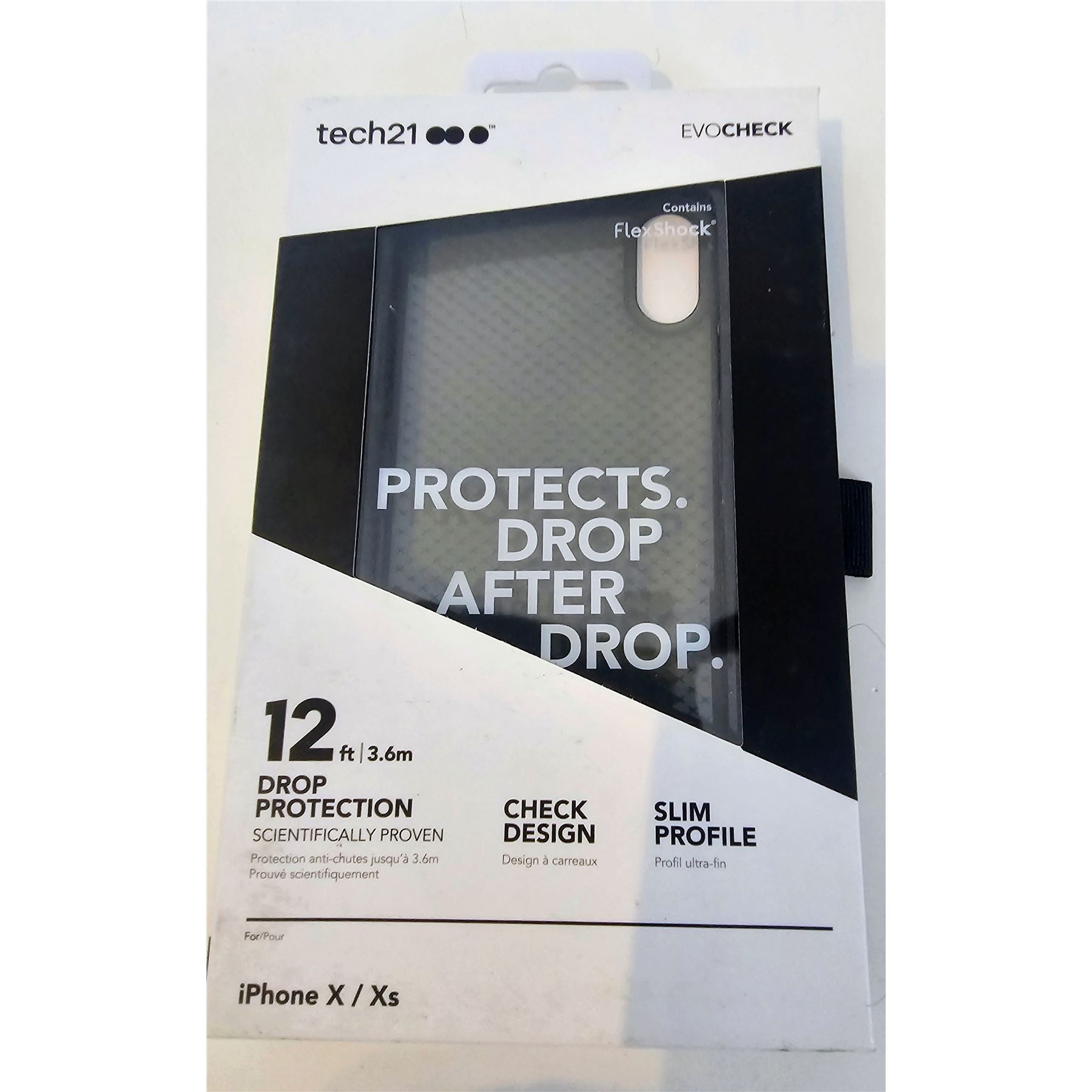 Tech21 EvoCheck case for iPhone X/Xs, 12ft drop protection with FlexShock technology, new. Slim profile with stylish check design, ensures device safety, new.