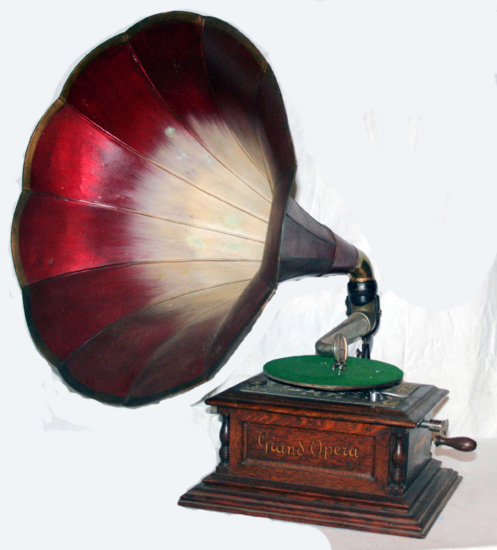 Grand Opera Zonophone with red morning glory horn. Nice oak case with decal on front "Grand Opera" and on side "Universal Talkaing Machine Mfg. Co. Case measures approx. 15.5" W x 12.5" D x 7.5" H. Attractive metal plate under turn table. Horn measures approx. 22" L and 22.5" D.