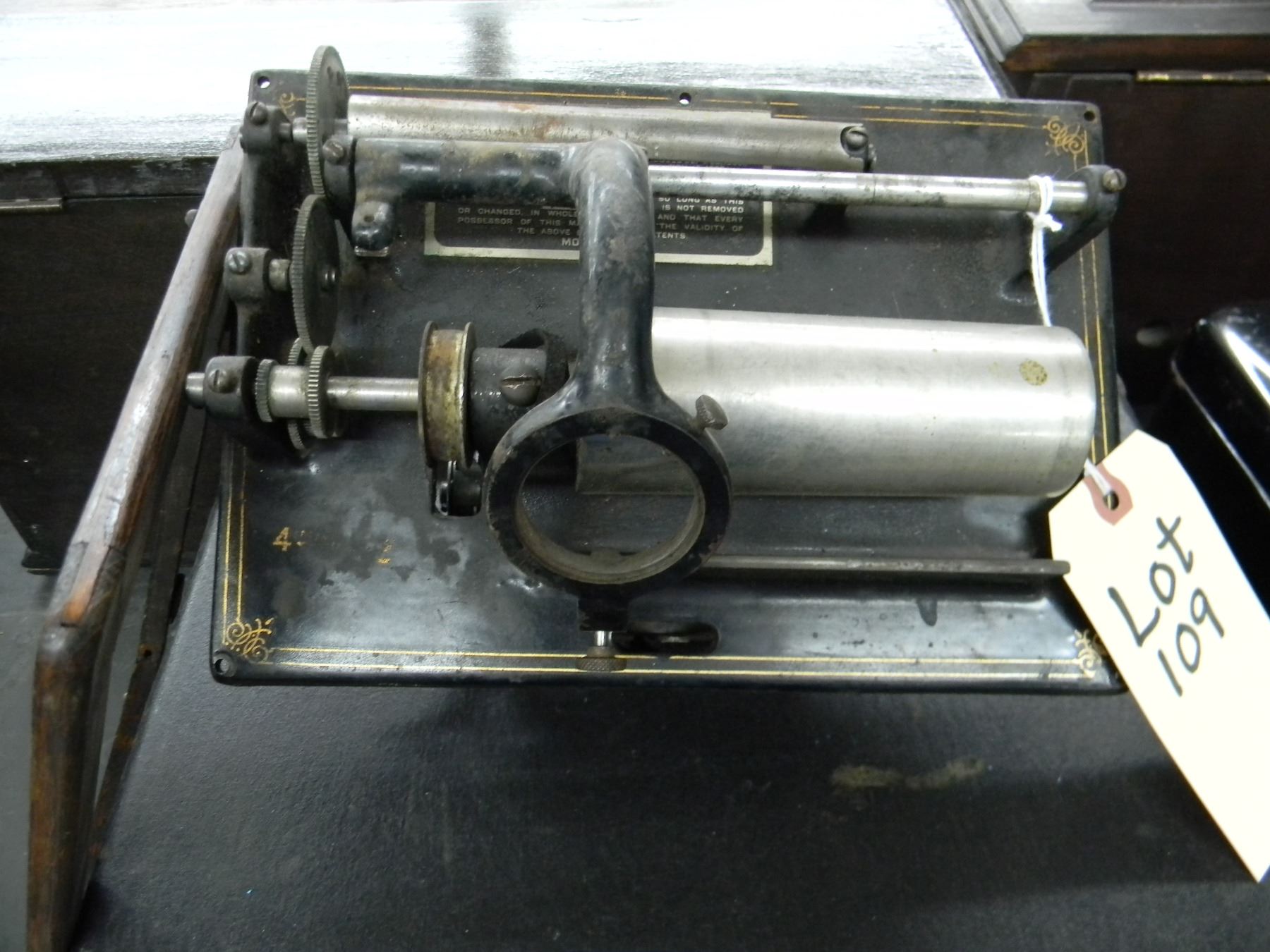 Base plate and motor for early two speed Edison Standard model D phonograph; includes wood frame.