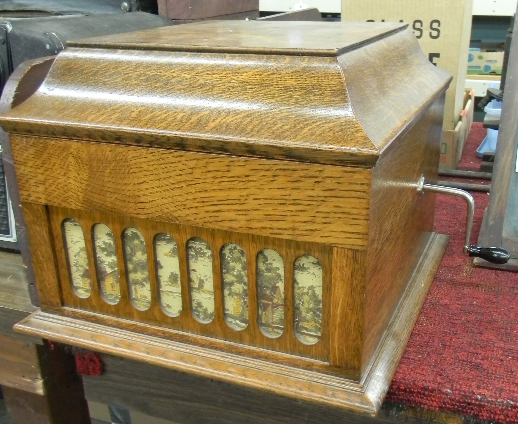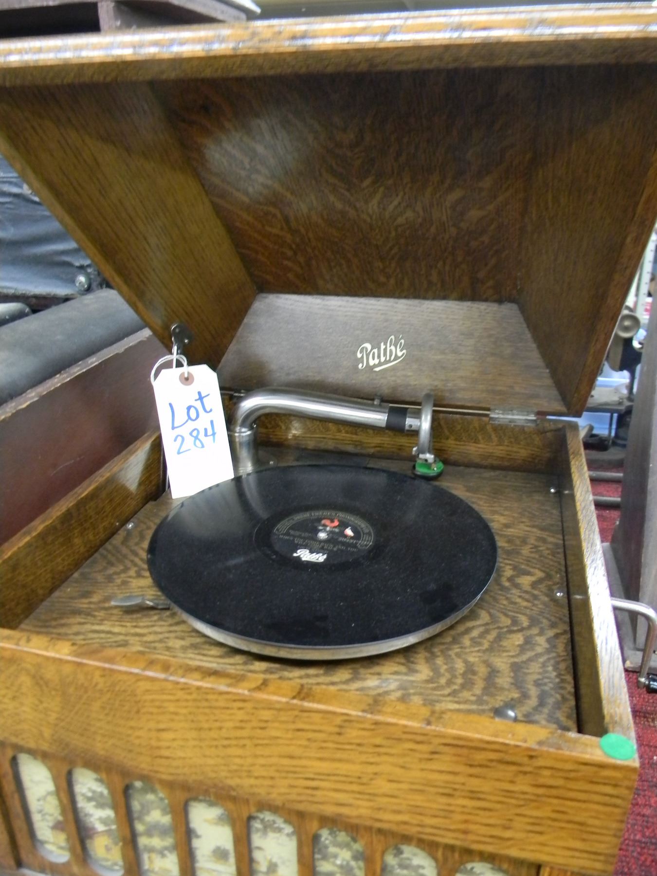 Really nice oak cabinet table top Pathe phonograph. Complete, works