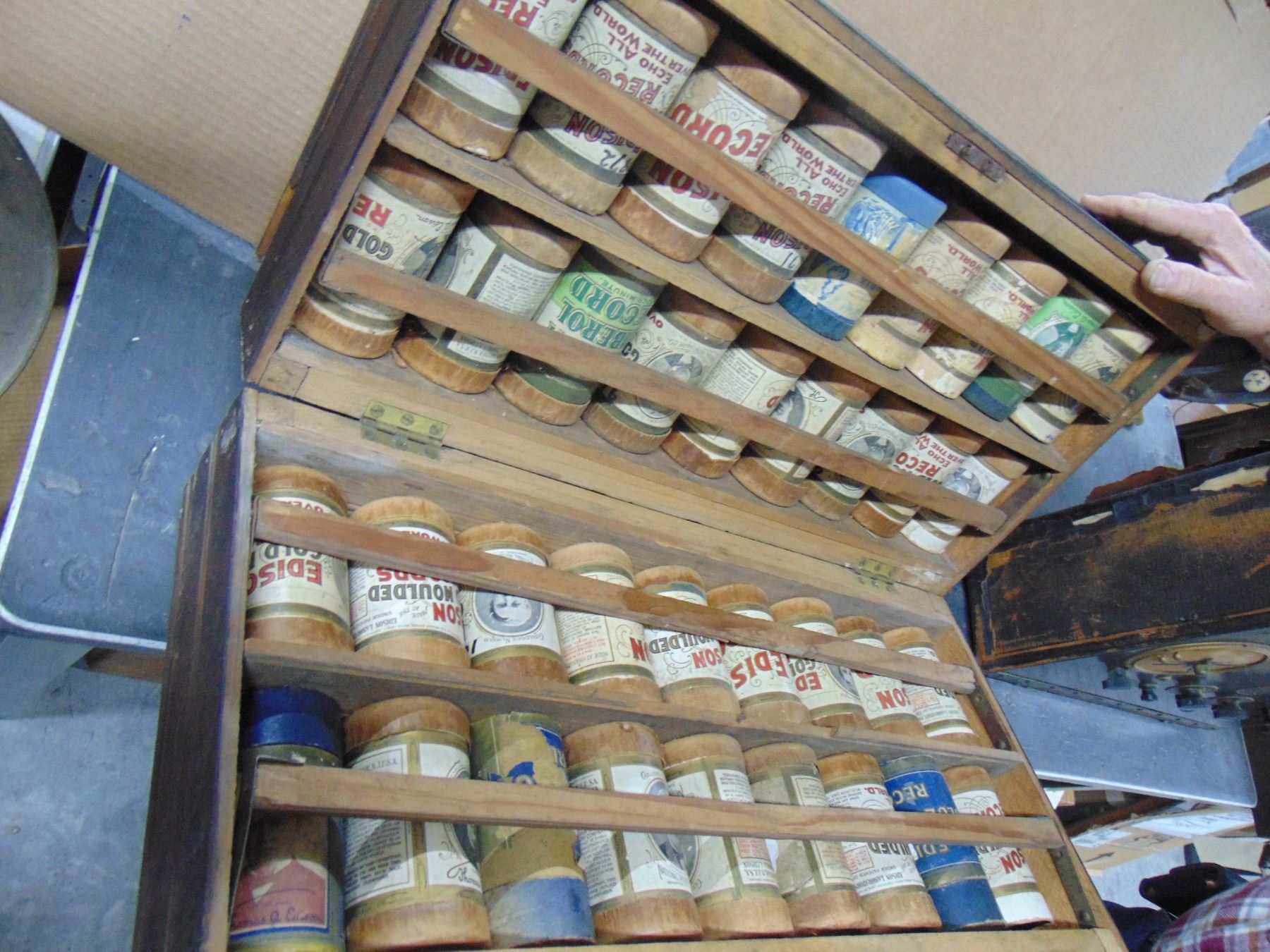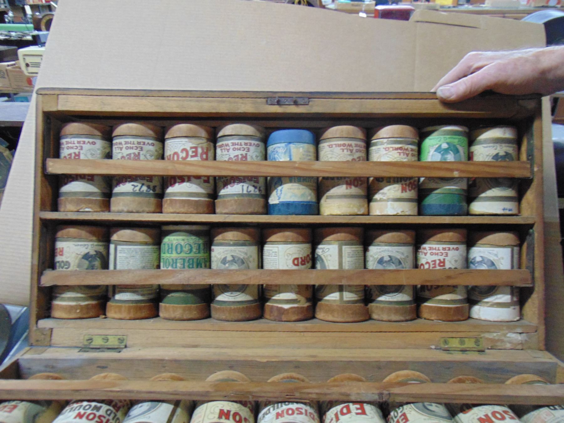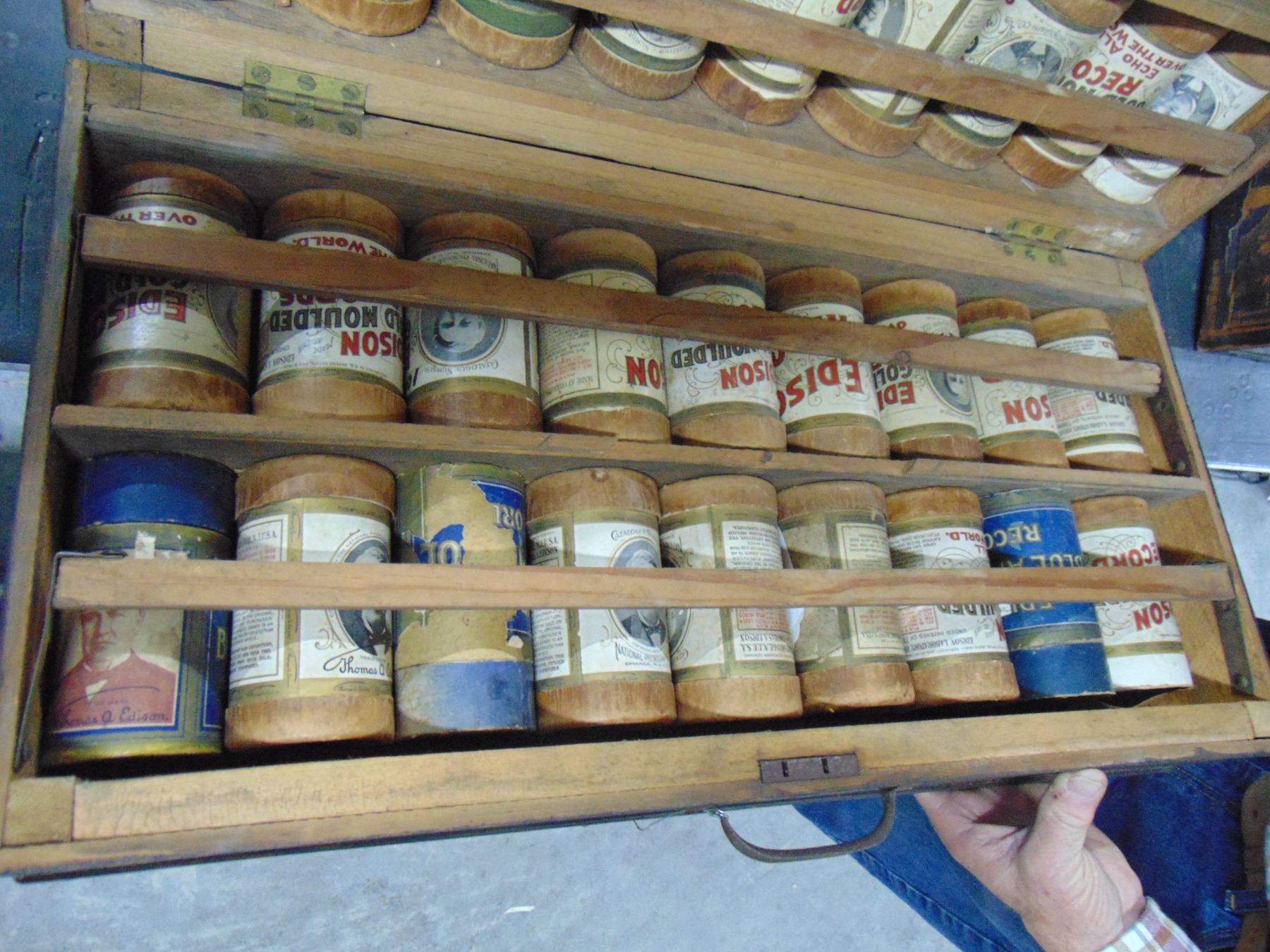Salesman's sample carrying case for cylinder records; includes 36 cylinder records in sleeves; rare; very nice lot!! UPDATE: seven of these records have mold on cylinders; two others have a chip on the cylinder, but appears to be playable.