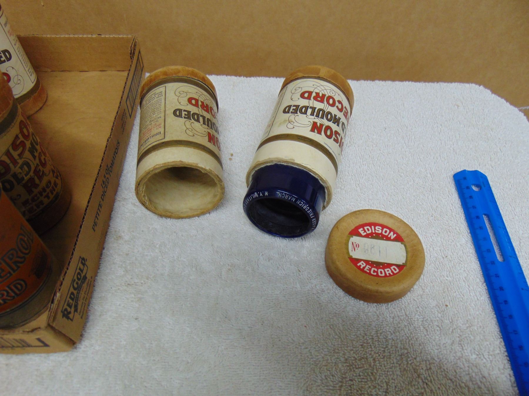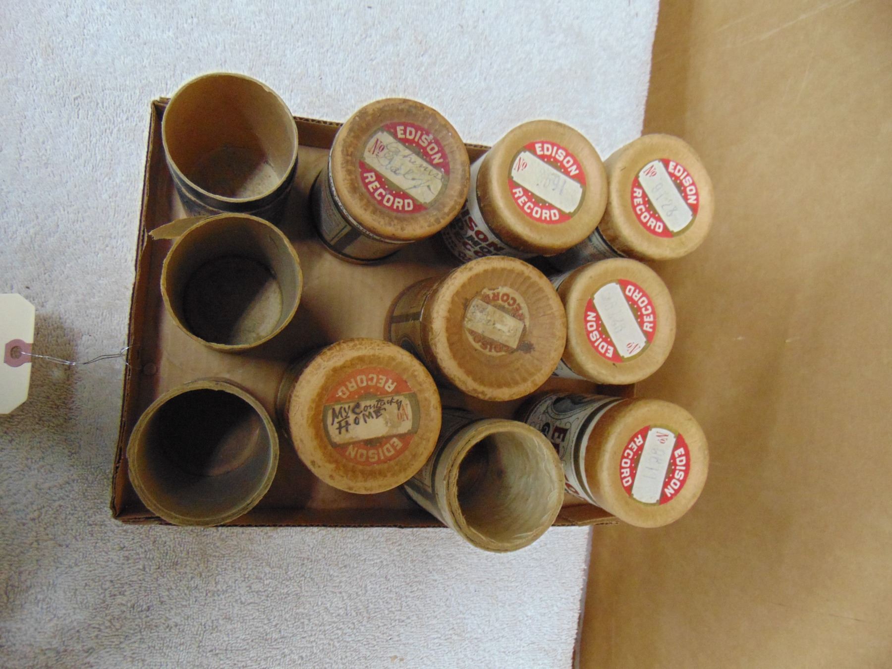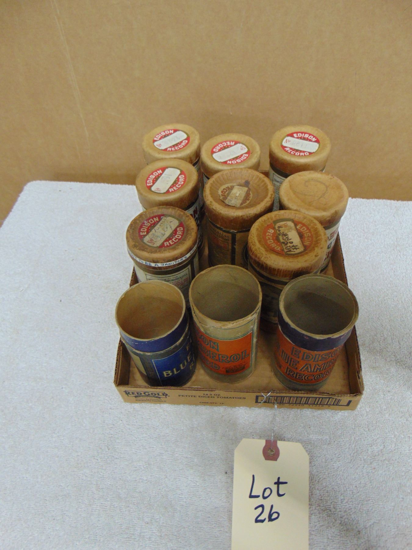 Flat of cylinder records; 5 records with boxes; 6 empty boxes