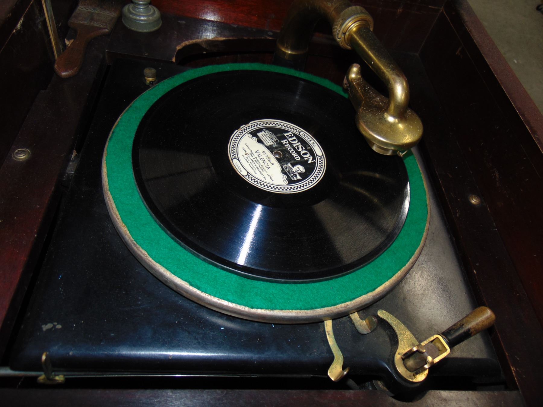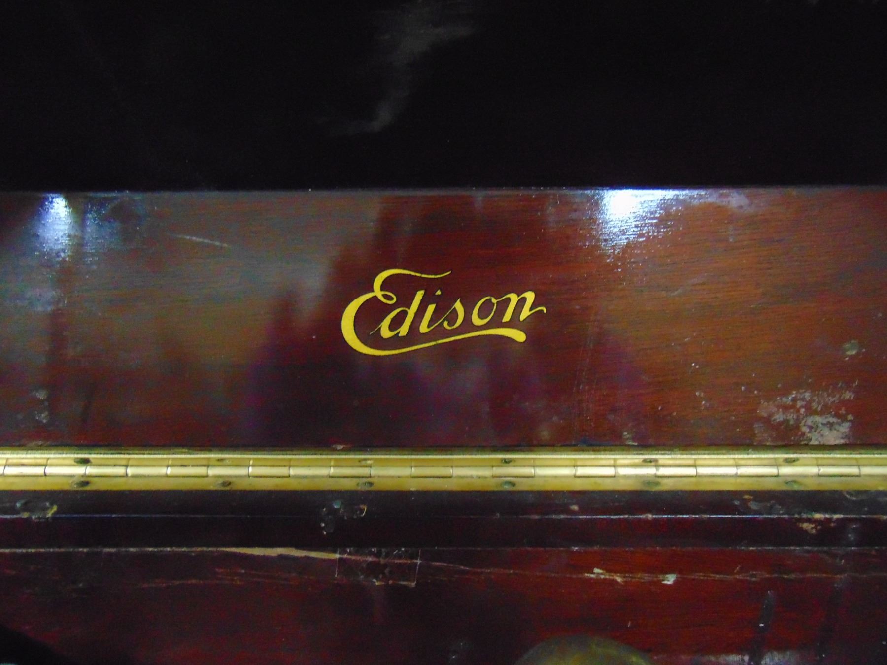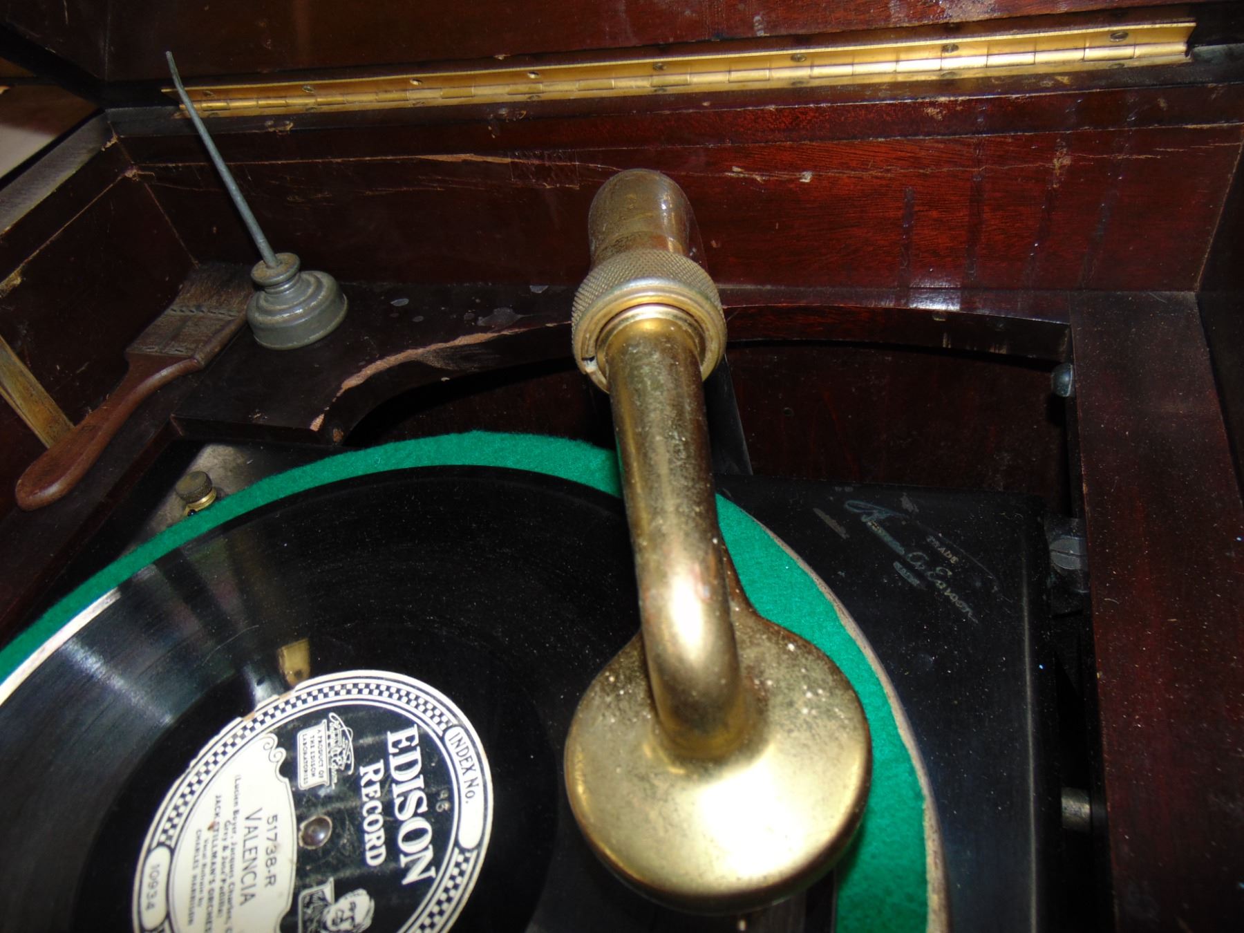 Edison Diamond Disc phonograph; mahogony cabinet; works well; includes Edison oil can and records